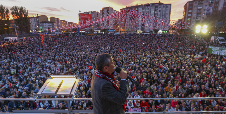 “Diğer yandan bu hafta sonu İsviçre’de Sosyal Demokrat Parti’nin kongresinde bu hafta sonu açılış konuşması yaptım, onur konuşmacısı ve Türkiye’deki başarıyı, mücadeleyi anlattım. Ondan önceki hafta Amsterdam’da Avrupa Sosyalist Partisi’nde, Avrupa Birliği’ne üye tüm partilerin çatı örgütünde. Ondan önceki hafta Madrid’de Sosyalist Enternasyonal'de, dünyadaki 78 ülkeden 89 parti ile bir araya geldik. ‘Cumhuriyet Halk Partisi iktidarında, Türkiye’nin Avrupa Birliği’ne tam üyeliğine destek, tam destek veriyorum’ diyen 89 partinin kapı gibi imzasını aldık, kapı gibi. Bunun için gençlere sesleniyorum. Gençlere. Hani 31 Mart akşamı bir seçim daha beklemeye karar veren gençlere sesleniyorum. Dünyanın en yavaş ve en pahalı internetine muhtaç değilsiniz. Dünyanın en pahalı etini de internetini de bize zaruret gibi dayatan iktidarı değiştireceğiz. Cumhuriyet Halk Partisi iktidarında hızla, GRECO kriterlerini ve Avrupa Birliği’nin standartlarını sağlayacağız. Aldığımız büyük destekle Türkiye’yi yıllar önce başvurduğumuz CHP iktidarında başvurduğumuz Avrupa Birliği’ne tam üyeliğine taşıyacağız. Ve seçimdeki sloganımız gençler, sloganımız şudur, şunu söyleyeceğiz: Yasaksız Türkiye, vizesiz Avrupa geliyor. Eskisehir şu güzelliğe bir bakar mısın? Bu tablo senin, bu muhteşem manzara senin. Eskişehir’de hep beraberiz ve Türkiye’ye iyi bir gelecek, kutuplaşma değil, kucaklaşma, birbiriyle kucaklaşma, kimseyi şeytanlaştırmadan, kardeşleştirmeyi vadediyoruz. Biz Türkiye’yi seviyoruz, Türkiye’yi germeye, kutuplaşma yaratmaya değil; yüzleri güldürmeye, ülkeyi kalkındırmaya geliyoruz. Buradan bir kez daha söylüyorum. Cumhuriyet Halk Partisi, gençlerin partisidir. Cumhuriyet Halk Partisi, kadınların partisidir. Cumhuriyet Halk Partisi, bütün anket kırılımlarında geçmişte olduğunun aksine, alt gelir seviyesinin partisidir. Yoksulların, emeklilerin, emekçilerin partisidir. Cumhuriyet Halk Partisi bu ülkenin geleceğinin partisidir. Cumhuriyet Halk Partisi kurulduğu gün gibi, 31 Mart daha dün gibi inanmayan baksın anketlerin bütününde aslanlar gibi Cumhuriyet Halk Partisi Türkiye’nin birinci partisidir.”